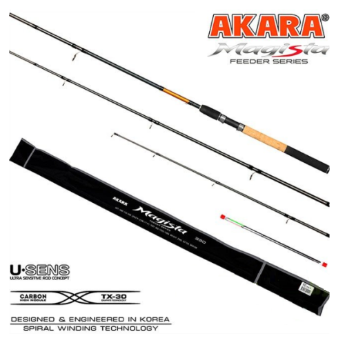 Magista Feeder – это расширение уже известной серии спиннинговых удилищ и рыболовных катушек, созданная по рекомендациям обладателей ранее выпущенных изделий этой серии. Удилища имеют строй Medium (средний) и предназначены для работы с тестом до 120 гр, 150 гр, 180 гр. Бланки удилищ Akara Magista Feeder выполнены из высокомодульного карбона TX-30 про-изводства Японского концерна Toray. Бланк удилища оснащен кольцами Kujira с покрытием оксида циркония, что позволяет не повреждать леску при ее использовании во время заброса кормушки или вываживании рыбы. Цельная рукоять удилища выполнена из пробки и неопрена и оснащена надежным катушкодержателем.