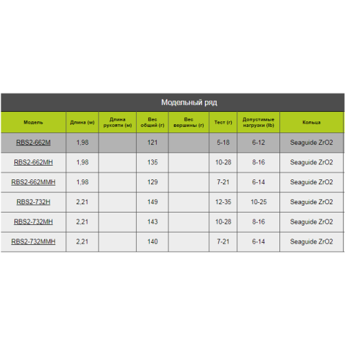 На всех спиннингах установлены удобные разнесённые рукоятки, винтовые катушкодержатели и кольца Seaguide со вставками из диоксида циркония (ZrO2).