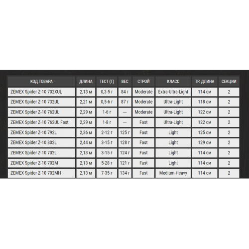 В честь своего десятилетия, компания Zemex выпустила обновлённую серию Spider Z 10. После анализа спроса, в серию были включены, наиболее популярные соотношения длинны и теста, для трех групп удилищ. В первую группу вошли спиннинги легкого и сверхлёгкого класса, универсальной направленности стиля лова. Во второй группе собрались более жесткие удилища, рассчитанные под все варианты твиченга, и работу с лодки. В так называемую, «береговую» группу, вошли тяжеловесы и дальнобойщики, с длинной до 2.74 метра, и тестом до 68 грамм. Переживая третье обновление, серия Spider главные параметры оставила неизменными, это невысокая цена, при первоклассном качестве.