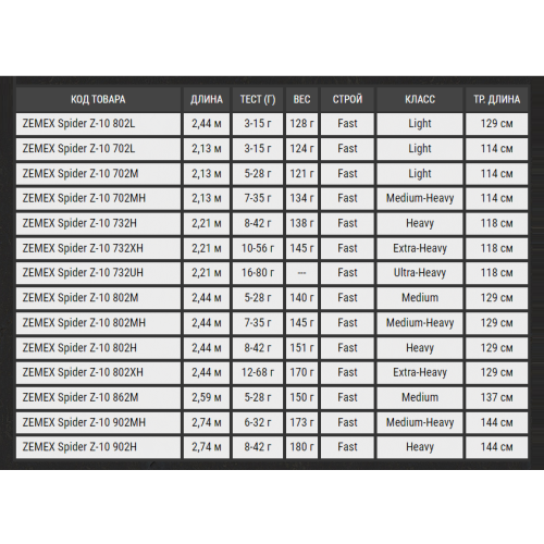 В честь своего десятилетия, компания Zemex выпустила обновлённую серию Spider Z 10. После анализа спроса, в серию были включены, наиболее популярные соотношения длинны и теста, для трех групп удилищ. В первую группу вошли спиннинги легкого и сверхлёгкого класса, универсальной направленности стиля лова. Во второй группе собрались более жесткие удилища, рассчитанные под все варианты твиченга, и работу с лодки. В так называемую, «береговую» группу, вошли тяжеловесы и дальнобойщики, с длинной до 2.74 метра, и тестом до 68 грамм. Переживая третье обновление, серия Spider главные параметры оставила неизменными, это невысокая цена, при первоклассном качестве.