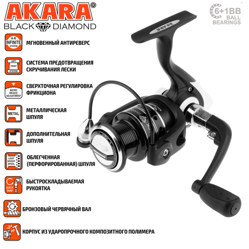 Катушка Akara Black Diamond - линейка универсальных среднескоростных безынерционных катушек для спиннинговой и поплавочной ловли от компании Akara Fishing. В катушках Black Diamond размещены семь подшипников, которые позволяют эксплуатировать катушку в экстремальных условиях и выдерживать значительные нагрузки при вываживании рыбы. Корпус катушки Black Diamond изготовлен из ударопрочного композитного полимера. Основная перфорированная шпуля изготовлена из алюминиевого сплава. Специальный профиль бортика шпули позволяет совершать дальние и точные забросы, предотвращает образование петель. Катушка прекрасно проявляет себя в работе со шнурами и лесками различных диаметров. Ротор катушки проходит компьютерную балансировку, что позволяет избежать биений катушки в момент подмотки лески. В комплекте поставляется дополнительная шпуля из графита. Катушка выпускается в трёх типоразмерах: 1000, 2000 и 3000.