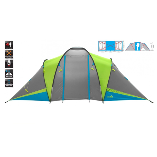 Кемпинговая 4-х местная двухслойная палатка с двумя спальнями и холлом. Съёмные спальни позволяют использовать различные варианты оборудования внутреннего пространства - двухслойная кемпинговая палатка с одним входом - увеличенный тамбур для комфортного размещения поклажи - входы во внутренние палатки наполовину продублированы антимоскитной сеткой - два спальных отделения - возможность установки навеса - кармашки для мелочей - вентиляционные окна с ветровыми клапанами - крючок для подвески фонаря - все швы палатки герметизированы при помощи термоусадочной водонепроницаемой ленты - петли для фиксации скатанного входа - площадь крепления нижних оттяжек усилена дополнительной вставкой Тип палатки: кемпинговая Количество мест: 4 Материал наружной палатки/ влагостойкость (мм H2O): 190Т Polyester PU/4000 Материал внутренней палатки: 190T Polyester дышащий+ B3 mesh Материал дна/ влагостойкость (мм H2O): PE 120g/m2 /8000 Материал каркаса: FG Материал колышков: сталь Количество дуг(стоек)/диаметр (мм): 4/9,5; 12,7;